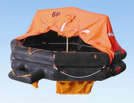救生筏平時(shí)包裝存放在玻璃鋼存放筒內(nèi),救生筏安裝在船舷專用筏架上,可將筏直接拋入水中,救生筏既可自動(dòng)充脹成形,供遇險(xiǎn)人員乘坐,如果船舶下沉太快,來不及將筏拋入水中,當(dāng)船舶沉到水下一定深度時(shí),救生筏架上的靜水壓力釋放器會(huì)自動(dòng)脫鉤,釋放出救生筏。